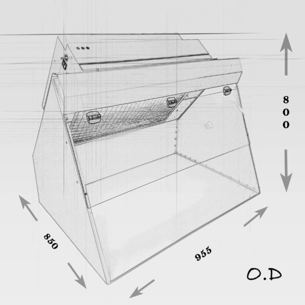 Steel construction finished in dove grey RAL9007 – fan/filter unit mounted onto hood enclosure – particulate filter – carbon impregnated fibre filter– 2 x axial fans, external rotor motor type brushless, UL, VDE and CSA approved – sealed electrical wiring and switch, downstream of filters.